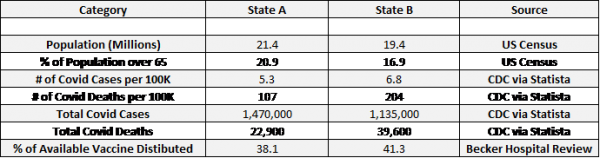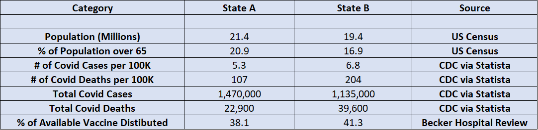 When it comes to vaccine distribution, State B is slightly ahead of State A, but by only 3%. (By the way, both states are in the middle of the pack nationwide: Becker reports that some states have completed over 70% complete of their vaccine distribution; while others lag below 20%.)